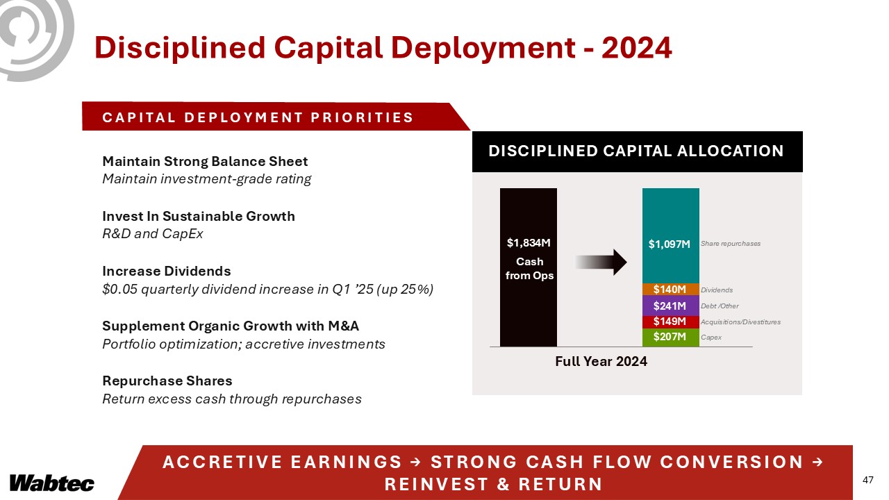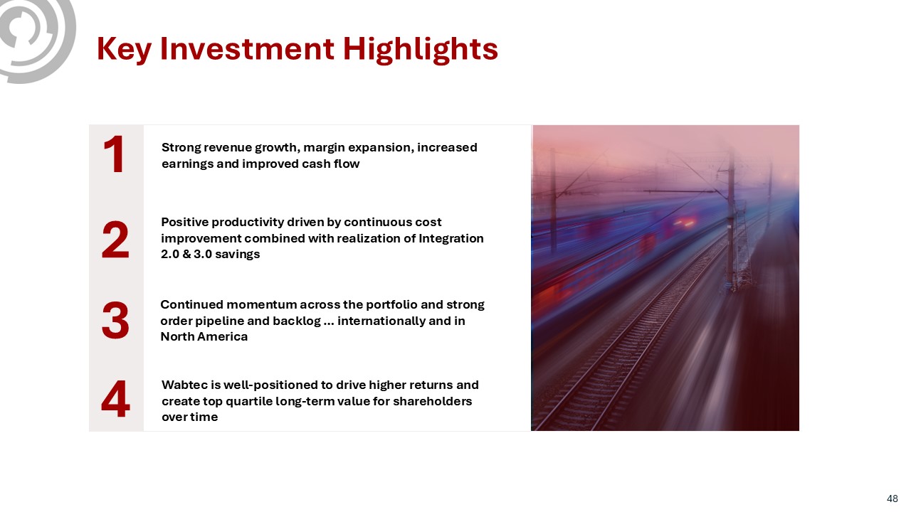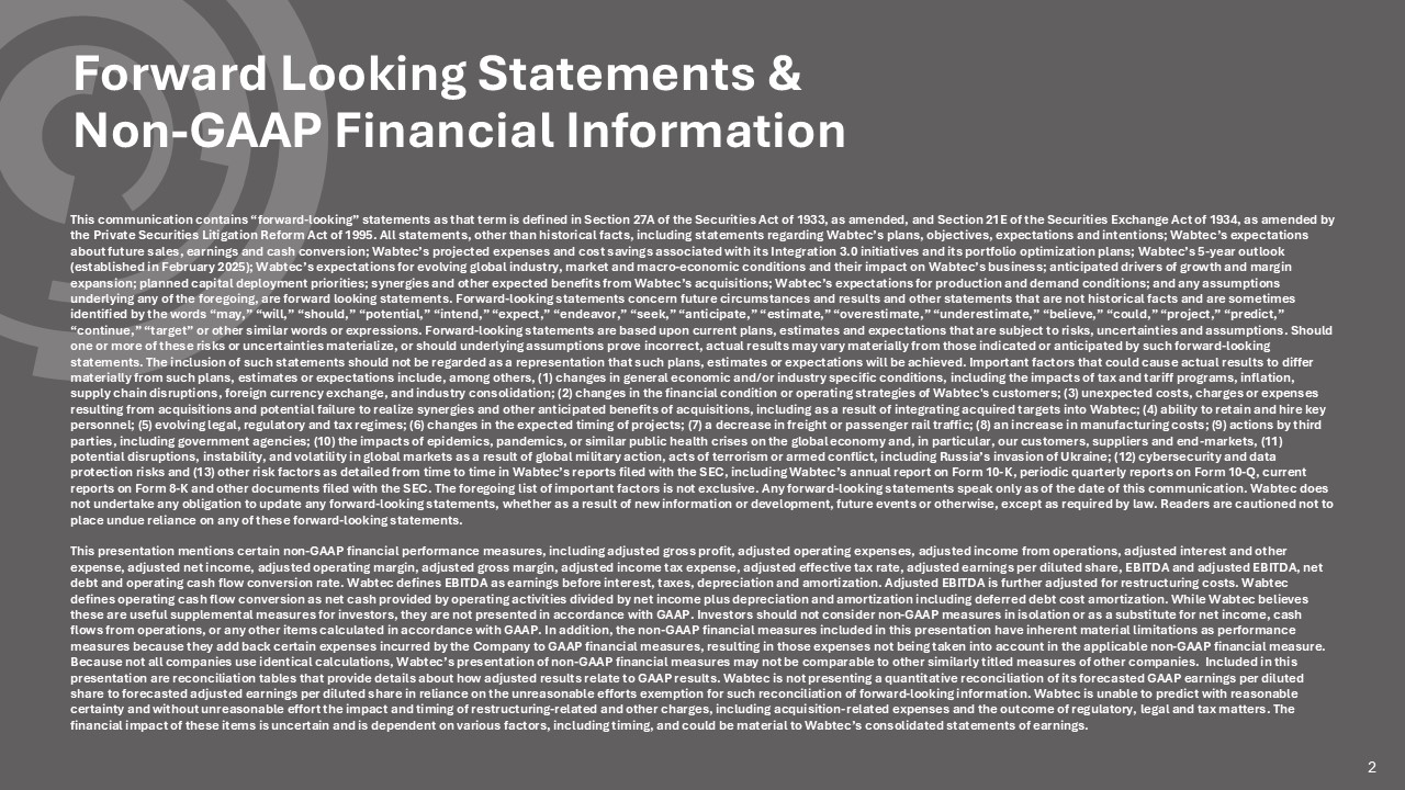 in February 2025); Wabtec’s expectations for evolving global industry, market and macro- economic conditions and their impact on Wabtec’s business; anticipated drivers of growth and margin expansion; planned capital deployment priorities; synergies
