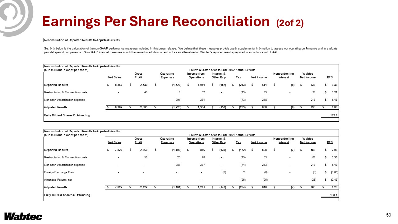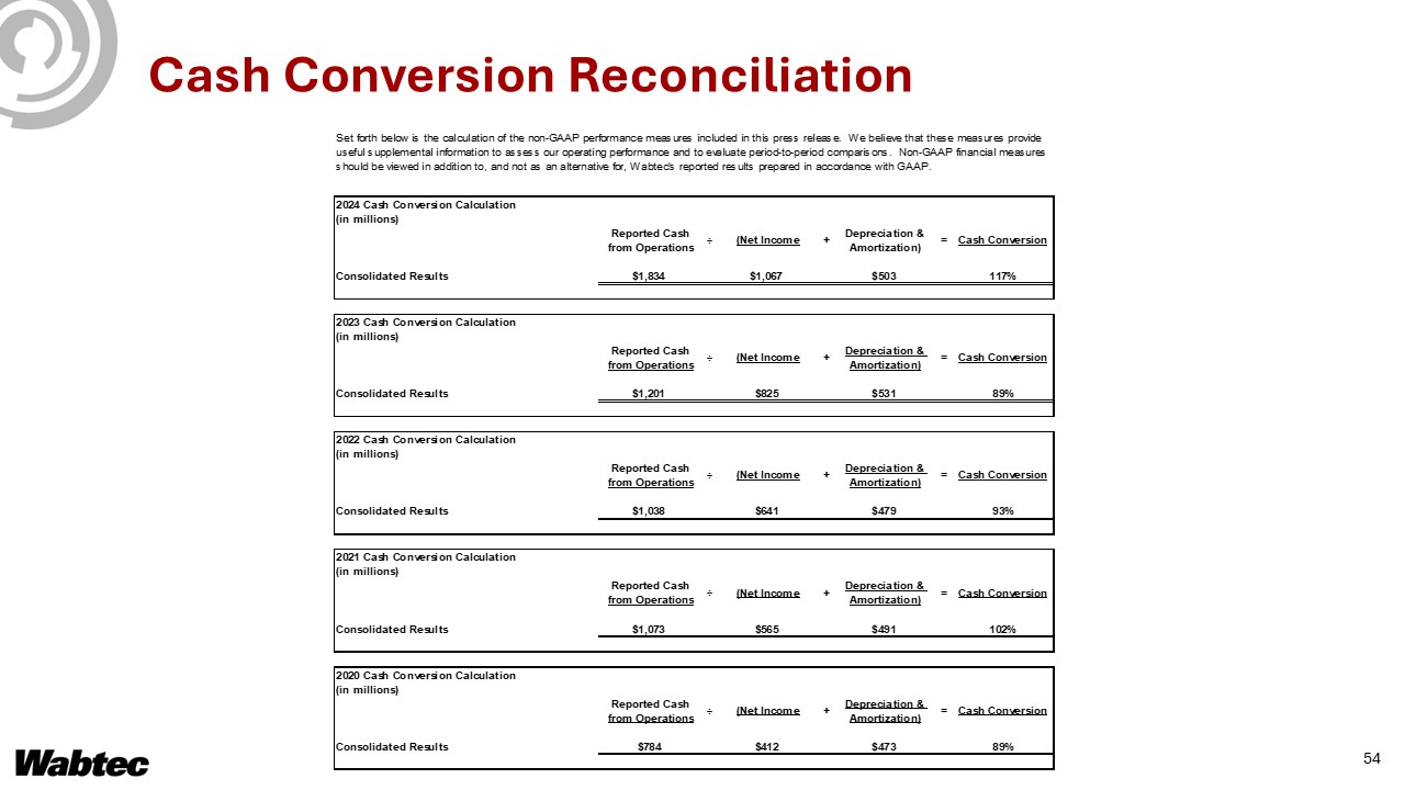 Wabtec’s expectations about future sales, earnings and cash conversion; Wabtec’s projected expenses and cost savings associated with its Integration 2.0 and 3.0 initiatives and its portfolio optimization plans; Wabtec’s 5-year outlook (established